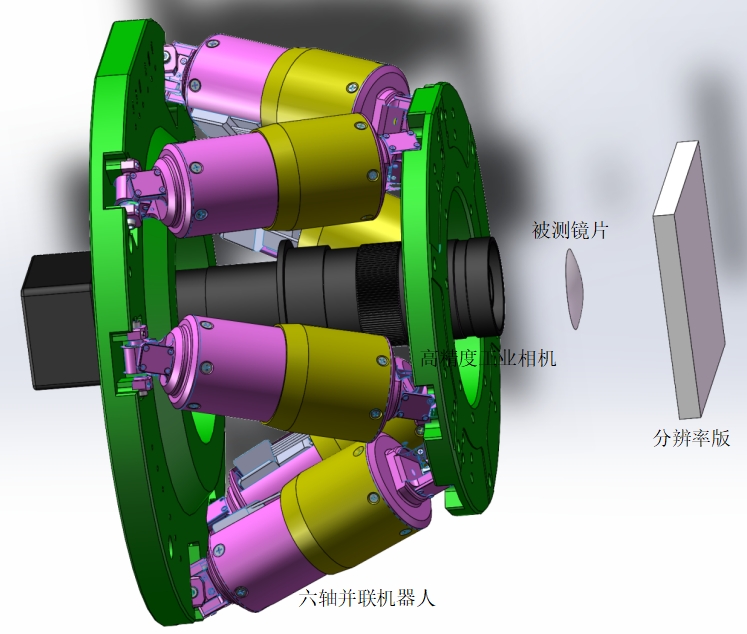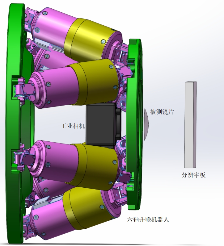 調(diào)整機(jī)構(gòu):調(diào)整工業(yè)相機(jī)、被測(cè)鏡片、分辨率測(cè)試圖案的相對(duì)機(jī)構(gòu)。在本方案中使用六軸并聯(lián)機(jī)器人來(lái)完成。