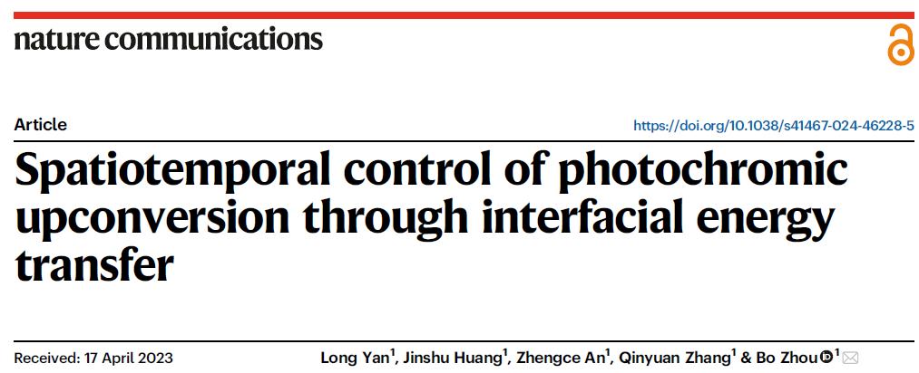 針對(duì)上述科學(xué)問題,華南理工大學(xué)發(fā)光材料與器件國(guó)家重點(diǎn)實(shí)驗(yàn)室周博教授團(tuán)隊(duì)提出了一種基于界面能量傳遞(IET)的概念模型,在時(shí)間和空間維度上實(shí)現(xiàn)了上轉(zhuǎn)換發(fā)光動(dòng)力學(xué)過程調(diào)控與光色動(dòng)態(tài)調(diào)節(jié)。該工作以“Spatiotemporal control of photochromic upconversion through interfacial energy transfer”為題發(fā)表在著名期刊Nature Communications上。