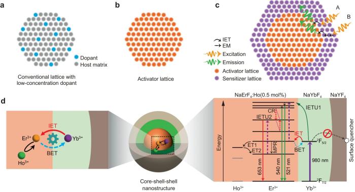圖1. 基于界面能量傳遞的發(fā)光模型設(shè)計(jì)。a,b)常規(guī)低濃度摻雜與發(fā)光基質(zhì);c)基于界面能量傳遞(IET)的核殼結(jié)構(gòu)設(shè)計(jì);d)NaErF4:Ho(0.5 mol%)@NaYbF4@NaYF4核-殼-殼納米粒子及能量過程示意圖。