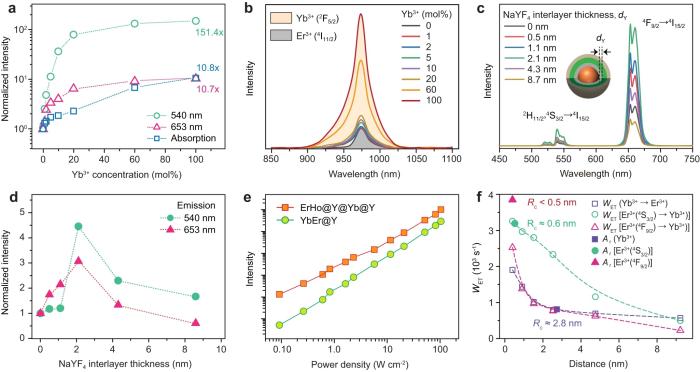 圖3. 納米空間調(diào)控上轉(zhuǎn)換發(fā)光。a)不同Yb3+摻雜濃度樣品的上轉(zhuǎn)換發(fā)光及吸收變化;b)吸收光譜;c,d)不同NaYF4夾層厚度樣品的上轉(zhuǎn)換光譜及強(qiáng)度比較;e)與常規(guī)納米粒子的對(duì)比;f)能量傳遞速率與離子距離的關(guān)系。