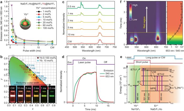 圖4. 時(shí)域調(diào)控上轉(zhuǎn)換發(fā)光:a,b)不同脈寬激發(fā)下的綠-紅比變化關(guān)系與色度坐標(biāo)(插圖為樣品的發(fā)光照片);c)不同脈寬激發(fā)下的歸一化光譜;d)Er3+發(fā)光強(qiáng)度隨激發(fā)時(shí)間的變化:e)非穩(wěn)態(tài)激發(fā)上轉(zhuǎn)換發(fā)光顏色變化的機(jī)理示意圖;f)時(shí)間分辨光譜及紅綠比變化趨勢(shì)。
