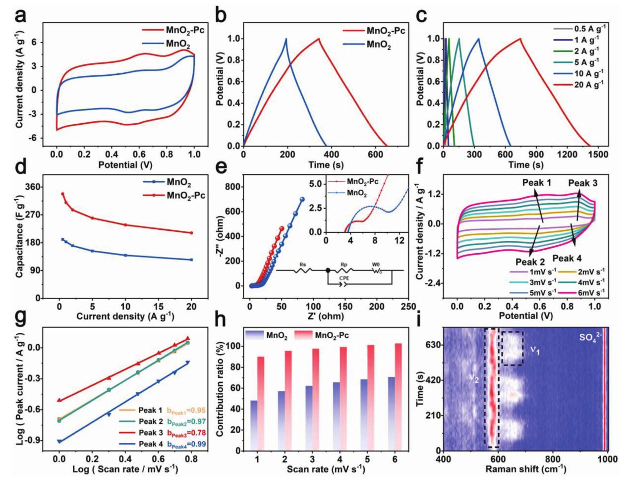 圖2:a)CV曲線,MnO2-Pc 和MnO2 在20 mV s−1;b)GCD曲線,MnO2-Pc 和MnO2 在 1 Ag−1;c)GCD曲線,MnO2-Pc在不同電流密度下;d)比容量 ,MnO2-Pc和MnO2在不同電流密度下;e)Nyquist圖,MnO2-Pc and MnO2;f) CV曲線,MnO2-Pc在不同掃描速率下;g)擬合曲線; h)電流貢獻值; i)三次充放電過程中原位拉曼光譜圖