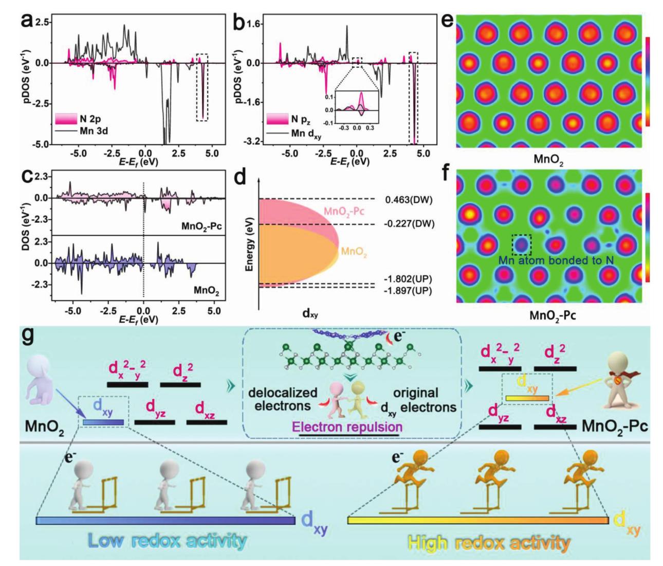 北京化工大學(xué)楊志宇研究員及團隊在知名期刊Advanced Energy Materials上發(fā)表了題為“Elevating the Orbital Energy Level of dxy in MnO6 via d–π Conjugation Enables Exceptional Sodium-Storage Performance”的文章。過渡金屬氧化物 (TMO) 具有固有的低電子電導(dǎo)率,而原子軌道相關(guān)的調(diào)節(jié)對于促進儲能應(yīng)用中的電子轉(zhuǎn)移動力學(xué)至關(guān)重要。該研究利用 d-π 共軛策略來提高 TMO 的電子電導(dǎo)率。選擇具有大共軛體系的酞菁 (Pc) 分子來修飾過渡金屬氧化物 (δ-MnO2)。通過密度泛函理論(DFT)模擬,驗證MnO2和Pc之間的強d-π共軛可以提高MnO6單元中低能軌道(dxy)的軌道能級,進而提高dxy的氧化還原活性,從而顯著提高電化學(xué)鈉存儲性能。