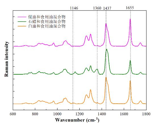 檢測(cè)不同工業(yè)油與食用油混合物的拉曼光譜圖如圖2所示。在三種混合物中均發(fā)現(xiàn)了1655cm-1和1745cm-1峰位處的食用油拉曼特征峰,表明三種混合物中均有食用油摻雜。此外,1146 cm-1峰位的白油拉曼峰、1360 cm-1峰位的石蠟拉曼峰、1437cm-1峰位可與圖1中的純品油拉曼峰相指認(rèn),作為油混合物的識(shí)別依據(jù)。