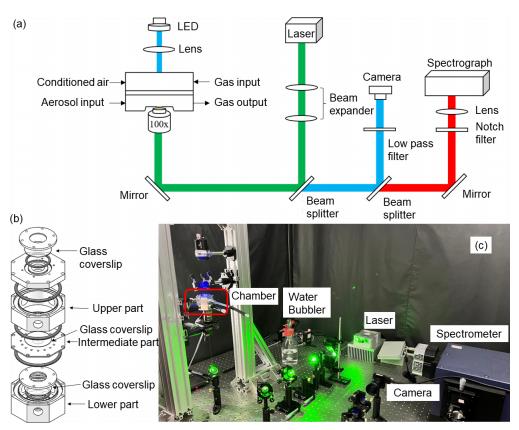 圖1.(a) 本研究中使用的氣溶膠光學鑷裝置示意圖。(b) 滴液粒子懸浮室的設計。(c) 系統(tǒng)主要部件的照片,包括懸浮室、水汽發(fā)生器、激光器、攝像機和卓立漢光公司的Omni-λ5004i光譜儀。