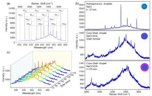 圖2. 基于光譜特征識別滴液形態(tài)的例子。(a) 捕獲的水性NaCl滴的拉曼散射特征圖。(b) 不同滴液形態(tài)的光譜:上子圖顯示了均勻水性飽和NaCl滴的典型光譜。中間子圖顯示了當SOA在飽和NaCl滴表面形成薄殼時的光譜。底部子圖顯示了當SOA繼續(xù)在飽和NaCl滴表面凝聚時,WGMs峰值減弱的光譜。(c) WGM分裂時間序列的例子:紅色峰值逐漸從一分為二,并且強度變?nèi)?,當SOA被加入到滴中時,表明形成了核-殼形態(tài)。