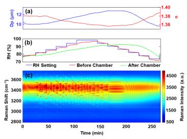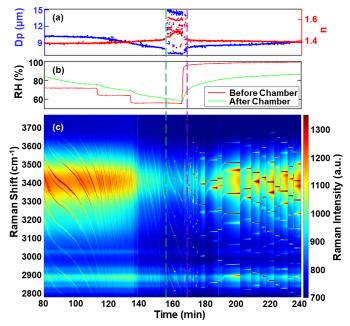圖3. (a) 檢索到的直徑(Dp)和折射率(n)。(b) 測量室內(nèi)前后的相對濕度(RH)。(c) 捕獲的水性NaCl滴液的拉曼光譜時間序列