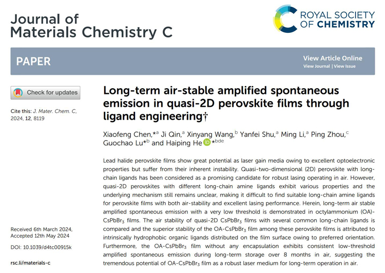 近日,浙江大學(xué)材料學(xué)院何海平教授團(tuán)隊(duì)在提升準(zhǔn)二維鈣鈦礦薄膜中放大自發(fā)輻射的穩(wěn)定性方面取得重要進(jìn)展,研究成果以“Long-term air-stable amplified spontaneous emission in quasi-2D perovskite films through ligand engineering”為題發(fā)表在國(guó)際知名學(xué)術(shù)期刊Journal of Materials Chemistry C (DOI: 10.1039/d4tc00915k)上。揚(yáng)州大學(xué)陳小鋒教授為第一作者,何海平教授、陳小鋒教授和陸國(guó)超博士為共同通訊作者。