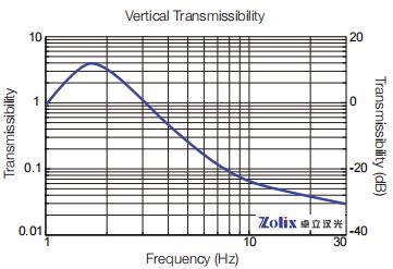 由圖可知,垂直方向在約1.8HZ處開始起到隔振效果;在3HZ處,隔振作用開始體現(xiàn);在5HZ處,振動波動僅有原來的10%-20%;在10HZ處,振動波動僅有原來的5%-10%。