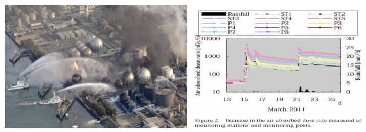 圖2 福島核事故場景(來源于網(wǎng)絡圖片),圖3.福島周邊監(jiān)測到的放射性氣溶膠強度[1](峰值對應事故中三次爆炸形成的氣溶膠釋放過程)