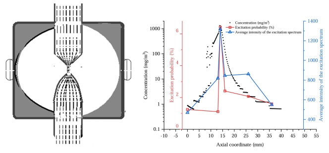 為彌補常規(guī)LIPS裝置探測限和應用需求的鴻溝,研究團隊系統(tǒng)地對顆粒物等離子體激光激發(fā)過程、等離子體閃光收集過程和數(shù)據(jù)處理過程進行了分析和平衡。利用顆粒物和氣體分子運動慣量的差異建立了顆粒物氣溶膠的空氣動力學聚焦系統(tǒng),將激光與氣流相互作用區(qū)域的顆粒數(shù)密度提升了兩個數(shù)量級,從而有效提升了激光脈沖在單位時間激發(fā)顆粒物等離子體的概率,縮短了測量周期(圖5)[3]。同時設計了一個封閉的等離子體閃光收集腔以提升系統(tǒng)的光信號幾何收集效率,預期光譜強度可以提升50倍。實際上,由于腔體對等離子體的約束效應,原子譜線的強度提升了近兩個數(shù)量級(圖6)[4]。