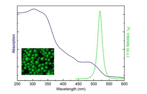 圖2 室溫下吸收光譜(藍色)和PL光譜(綠色)