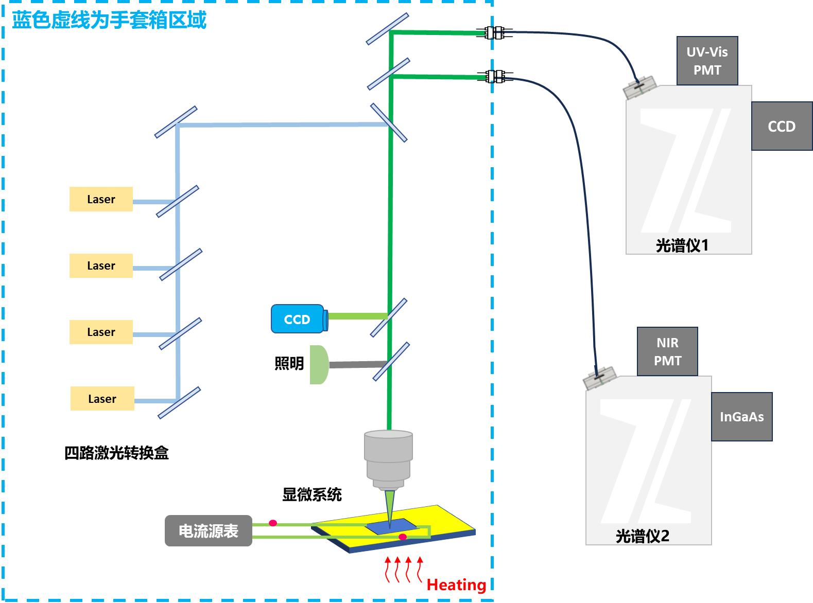 圖1. 手套箱-顯微原位穩(wěn)態(tài)瞬態(tài)熒光及光電流測(cè)試系統(tǒng)