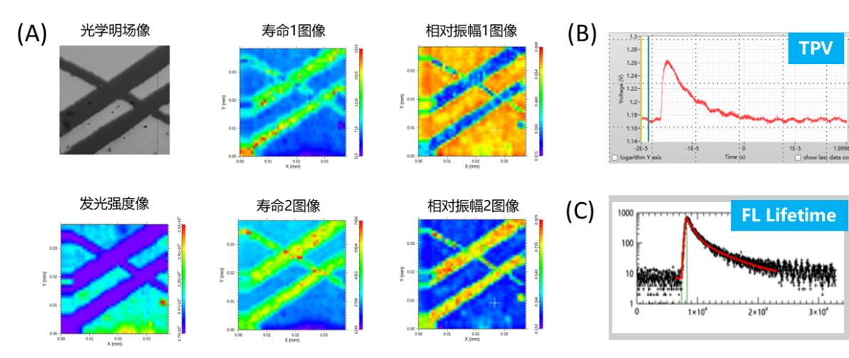 圖2.(A)熒光壽命成像;(B)瞬態(tài)光電壓測(cè)試;(C)熒光壽命測(cè)試