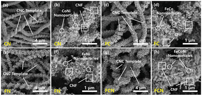圖二: CN, FC, FN, FCN復(fù)合材料的SEM圖像。