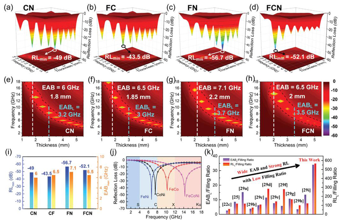 圖五:a、e) CN, b、f) FC, c、g) FN, d、h) FCN復(fù)合材料的三維RL值及其投影圖;i) CN、FC、FN和FCN復(fù)合材料的*小RL值和*大EAB值;j) CN、FC、FN、FCN復(fù)合材料的*小RL曲線;k)*小RLL/填充比和*大EABL/填充比與*近文獻(xiàn)報(bào)道的其他碳/磁基吸收劑的比較。