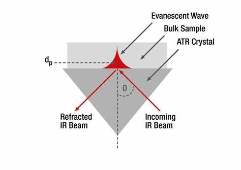 由于紅外透射測(cè)量需要對(duì)樣品進(jìn)行研磨和壓片等繁瑣的前處理,而利用紅外ATR測(cè)量可以直接進(jìn)行測(cè)量,這大大提高了紅外光譜的測(cè)量效率。ATR模式是基于全內(nèi)反射原理,當(dāng)一束紅外光從光密介質(zhì)到光疏介質(zhì),會(huì)產(chǎn)生一束反射光和折射光,當(dāng)入射角大于全反射角時(shí),折射光線將沿晶體界面?zhèn)鞑?,引起隱逝波。隱逝波傳播方面沿界面進(jìn)行,等相位面垂直于界面,隨著遠(yuǎn)離界面距離增加,光強(qiáng)逐漸衰減為零,衰減深度為: