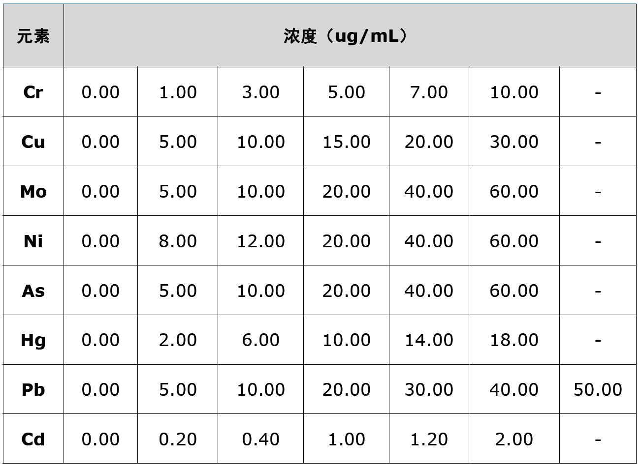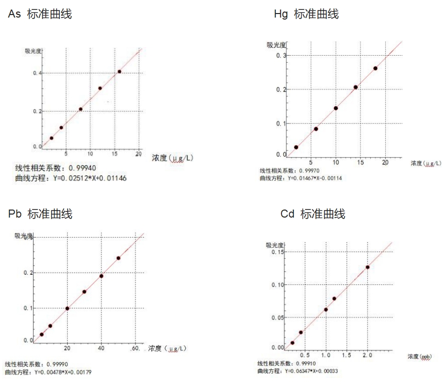 按下表配制各元素的系列標(biāo)準(zhǔn)溶液,待儀器工作穩(wěn)定后,依次進樣,根據(jù)濃度和吸光度,繪制標(biāo)準(zhǔn)曲線。