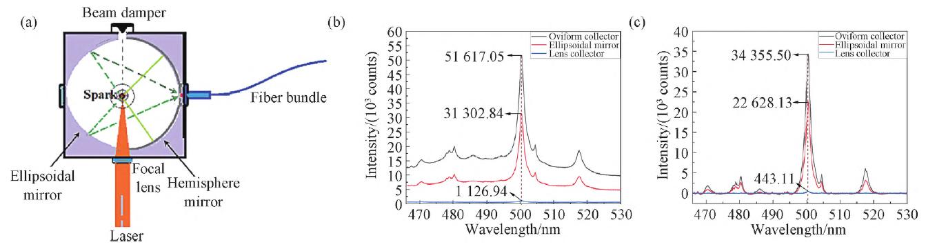 圖1. (a)增強型等離子體輻射光譜收集器結構示意圖及采用不同光譜收集方法采集到的空氣特征光譜,(b)原始光譜,(c)扣除背景后的光譜[2]