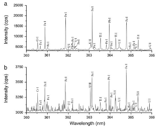 圖3. (a)鈾礦石壓片,(b)鈾礦石粉末LIPS光譜