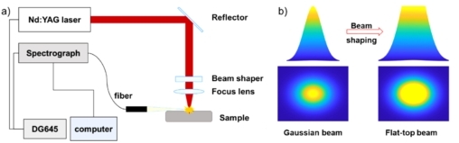 在優(yōu)化激光等離子體激發(fā)條件方面,華中科技大學武漢光電國家研究中心的李青洲等[7]采用激光誘導擊穿光譜結合激光誘導熒光(Laser-Induced Breakdown Spectroscopy combined with Laser-Induced Fluorescence, LIBS-LIF)提高鈾礦石中的鈾特征譜線強度;研究結果表明,與僅采用LIPS技術相比,采用LIBS-LIF技術后U II 409.01 nm特征譜線強度提升21.3倍,鈾元素檢出限(LoD)由199 ppm下降至35 ppm。清華大學姬建訓等[8]通過將入射激光整形為平頂光束,有效改善了激光強度的空間分布,降低了激光與等離子體作用過程中的等離子體屏蔽效應,提高了等離子體輻射光譜強度。實驗裝置和光束整形如圖4所示,研究結果表明,光束整形后,鈾礦石中鈾元素特征譜線U II 409.013 nm強度提升約5倍,鈾元素檢出限達到21.2 ppm。中國原子能科學研究院高智星等[9]研發(fā)的背負式LIPS裝置通過提升激光-等離子體閃光傳輸效率,將鈾礦石中鈾元素的檢出限降低至18 ppm。激光等離子體激發(fā)條件的優(yōu)化僅需對裝置硬件進行簡單改進即可有效改善LIPS探測限,無需進行樣品前處理,時效性好,適用于鈾礦石的原位、現(xiàn)場、快速分析。