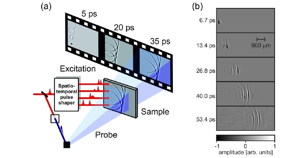 圖3. 基于超短脈沖探針的晶格振動波超快光學(xué)成像。[2] (a)時空相干控制和探測實驗; (b)聲子極化子的產(chǎn)生和放大。
