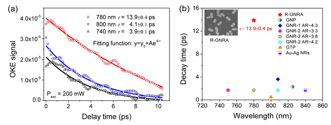 (a) R-GNRA在740/780/800 nm的OKE衰減曲線,780 nm處弛豫時間*長。