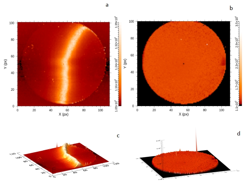 圖 先進(jìn)陶瓷材料,a(非自動(dòng)聚焦)b(自動(dòng)聚焦)的拉曼成像平面圖;c(非自動(dòng)聚焦)d(自動(dòng)聚焦)的拉曼成像剖面圖