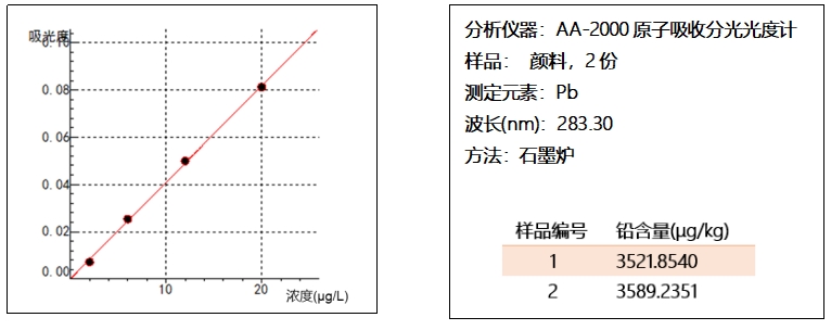食品添加劑是指為改善食品品質(zhì)和色、香、味,以及為防腐、保鮮和加工工藝的需要而加入食品中的人工合成或者天然物質(zhì)。食品用香料、膠基糖果中基礎劑物質(zhì)、食品工業(yè)用加工助劑、營養(yǎng)強化劑也包括在內(nèi)?!妒称钒踩珖覙藴?食品添加劑使用標準》(GB 2760-2024)中對食品添加劑*基本的要求是不應對人體產(chǎn)生任何健康危害。此次天水幼兒園血鉛事件中違規(guī)使用顏料作為食品添加劑,那么在一般的顏料中鉛含量究竟是什么水平呢?圖1為卓立漢光AA-2000原子吸收分光光度計測定顏料鉛含量的示例,兩份樣品測出來的Pb含量高達3521.8540μg/kg和3589.2351 μg/kg??梢婎伭鲜墙^對禁止作為食品添加劑使用的。