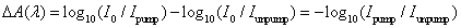 瞬態(tài)吸收測試的是材料被激發(fā)后吸收相對于穩(wěn)態(tài)的瞬時變化。根據(jù)比爾-朗伯(Beer-Lambert)定律,一束光穿過均勻吸收介質會發(fā)生強度的衰減。以溶液樣品為例,對于波長為λ的光,忽略散射作用,其透過樣品的光強正比于光程L,液體樣品的濃度c,以及其摩爾吸收系數(shù)e,其吸收度(Absorbance)表達為:
