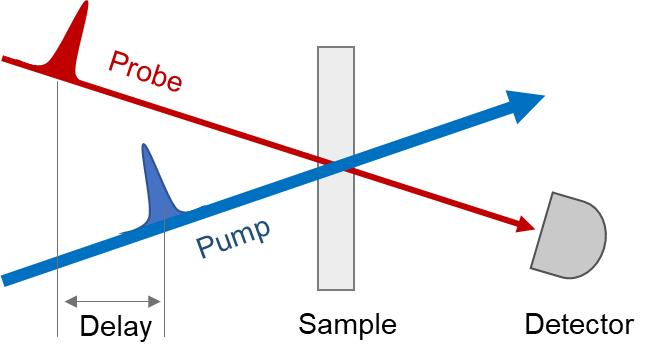 類似于大部分超快光譜技術,通常意義上的瞬態(tài)吸收是基于泵浦-探測(Pump-Probe)機制構建的技術,如圖1所示。其中泵浦光為一束強脈沖激光,用于激發(fā)被測試材料;探測光為一束較弱的脈沖激光(通常功率密度小于泵浦光兩個量級以上),用于探測材料被泵浦光瞬時激發(fā)之后的吸收度的變化。瞬態(tài)吸收光譜信號由有泵浦光與無泵浦光激發(fā)時探測光透過材料的吸收度相減獲得,即: