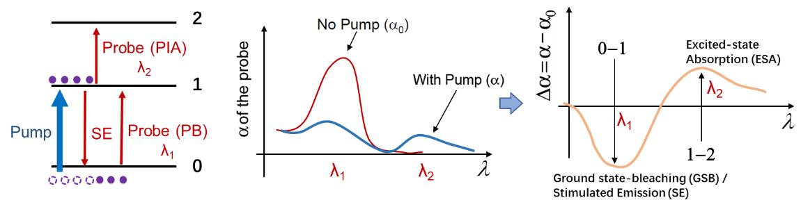 圖2、飛秒瞬態(tài)吸收的主要過程和光譜特征。