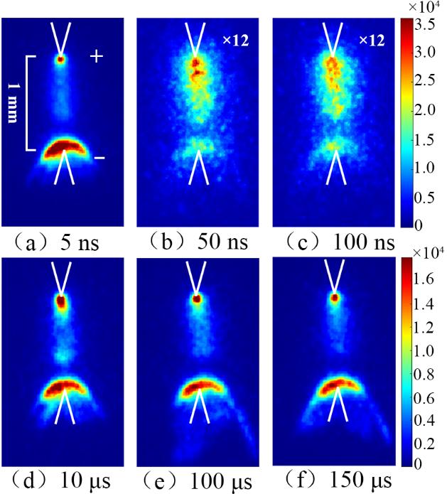 圖2: 在120 kΩ限流電阻下,門寬為2 ns(a-c)和100 ns(d-f)時拍攝的脈沖放電圖像。