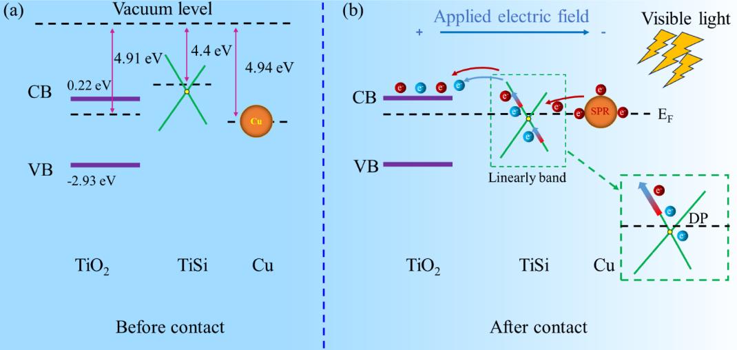 開發(fā)高效、穩(wěn)定的光電催化材料是實(shí)現(xiàn)太陽(yáng)能驅(qū)動(dòng)水分解制氫的關(guān)鍵。湖北工業(yè)大學(xué)等單位的研究團(tuán)隊(duì)結(jié)合磁控濺射與真空熱蒸發(fā)技術(shù),在TiO2納米棒陣列上依次沉積拓?fù)浒虢饘賂iSi薄膜與等離子體Cu納米顆粒,構(gòu)建出TiO2/TiSi/Cu復(fù)合光陽(yáng)極。該結(jié)構(gòu)充分利用TiSi的拓?fù)渚€性能帶結(jié)構(gòu)作為電子的高速傳輸通道,協(xié)同 Cu的表面等離子體共振(SPR)效應(yīng),共同增強(qiáng)光吸收、促進(jìn)載流子分離與傳輸、延長(zhǎng)載流子壽命,進(jìn)而顯著提升可見光驅(qū)動(dòng)下的光電催化分解水性能。在>420 nm可見光照射下,TiO2/TiSi/Cu光陽(yáng)極的光電流密度達(dá)到純TiO2的17.84倍,并表現(xiàn)出優(yōu)異的循環(huán)穩(wěn)定性。這些結(jié)果不僅為TiO2基光陽(yáng)極的性能優(yōu)化提供了新思路,也為拓?fù)洳牧显谀茉创呋I(lǐng)域的應(yīng)用拓展了新的方向。