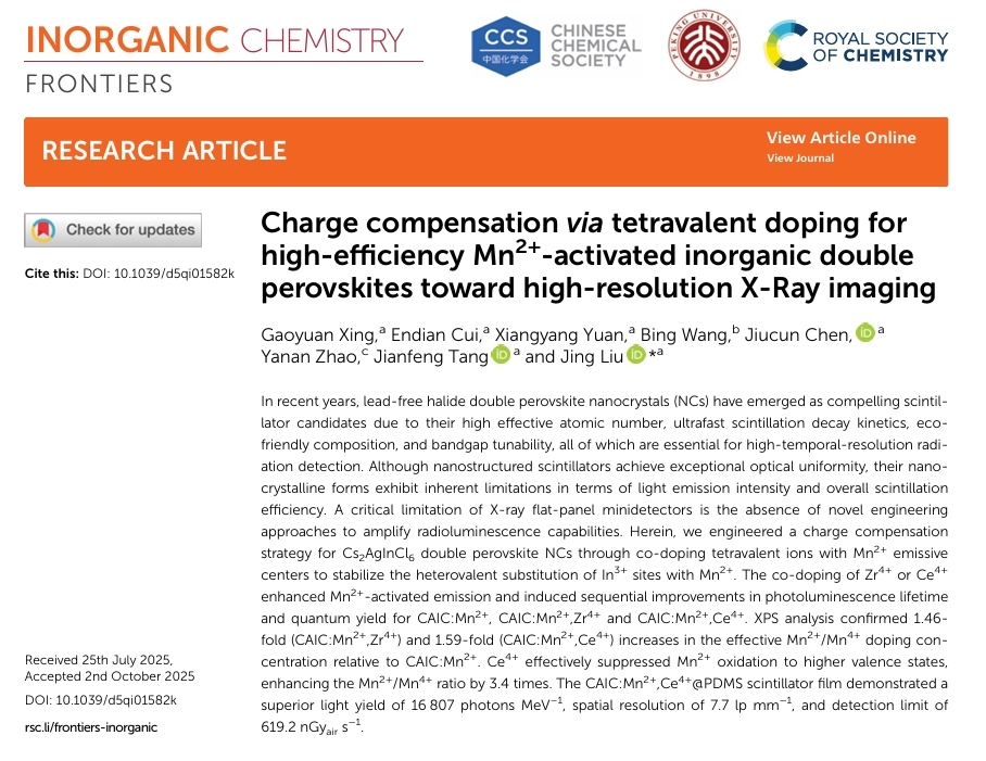 西南大學(xué)材料與能源學(xué)院劉婧團(tuán)隊在X射線成像領(lǐng)域取得重要進(jìn)展。研究成果以“Charge compensation via tetravalent doping for high-efficiency Mn2+-activated inorganic double perovskites toward high-resolution X-Ray imaging”為題發(fā)表在國際知名期刊《Inorganic Chemistry Frontiers》上。西南大學(xué)為該論文第一單位,劉婧副教授為論文通訊作者。今天小卓為大家分享該研究成果,希望對您的科學(xué)研究或工業(yè)應(yīng)用帶來一些靈感和啟發(fā)。
