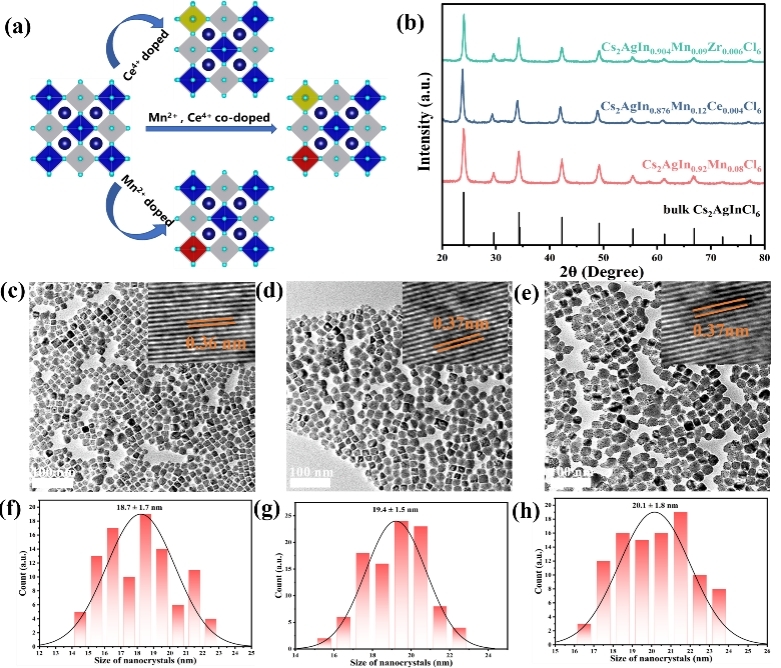 圖1 CAIC:Mn2+、CAIC:Mn2+, Zr4+和CAIC:Mn2+, Ce4+納米晶的(a)晶體結(jié)構(gòu)的示意圖;(b)XRD圖;(c,d,e)分別為CAIC:Mn2+、CAIC:Mn2+, Zr4+和CAIC:Mn2+, Ce4+納米晶的透射電子顯微鏡和高分辨電子顯微鏡圖像;(f,g,h)為相對應(yīng)的納米晶的尺寸分布圖。