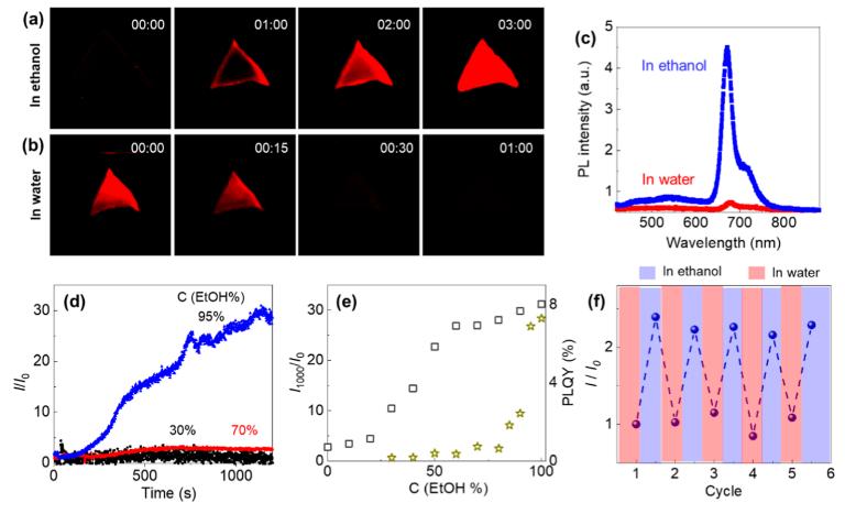 圖4 乙醇誘導(dǎo)相分離對PVA/PAAm-CD水凝膠熒光的調(diào)控:(a,b) 熒光照片顯示乙醇中增強與水中的恢復(fù);(c) 相分離態(tài)熒光光譜顯著增強;(d) 不同濃度乙醇中的熒光強度時程曲線;(e) 熒光增強比與溶劑極性/PLQY的關(guān)聯(lián);(f) 五次循環(huán)驗證熒光開關(guān)的可逆性。