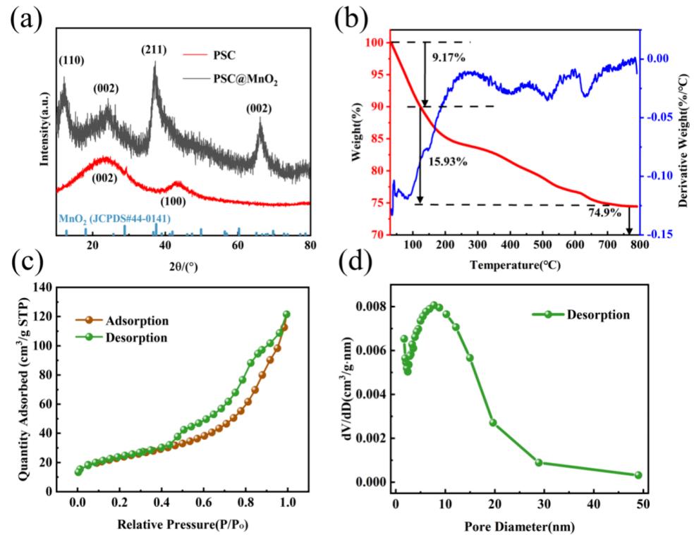 XRD圖譜顯示PSC在23.7°和43.9°處出現(xiàn)兩個寬峰,對應無定形碳的(002)和(100)晶面;PSC@MnO?在12.7°、23.7°、37.5°和65.1°處出現(xiàn)特征峰,分別對應MnO?的(110)、(002)、(211)和(002)晶面(圖3a)。熱重分析顯示PSC@MnO?中MnO?的質(zhì)量分數(shù)約為74.9 wt%(圖3b)。N?吸附-脫附等溫線顯示復合材料為介孔結構,比表面積為81.08 m²/g,平均孔徑為7.24 nm(圖3c,d)。
