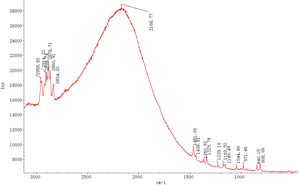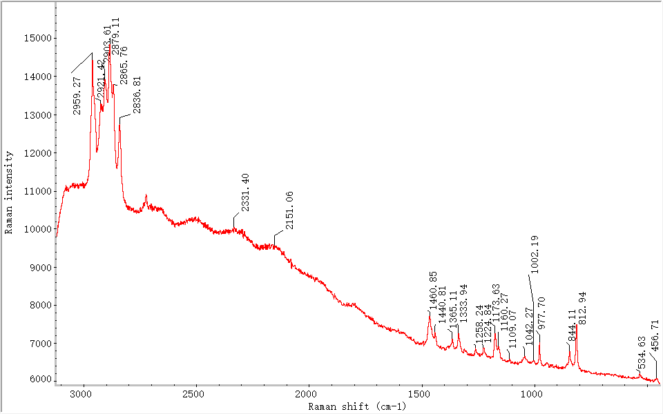 聚丙烯有2954cm-1、2923cm-1、2903cm-1、2885cm-1、2841cm-1、2723cm-1、1459cm-1、1438cm-1、1360cm-1、1330cm-1、1167cm-1、1167cm-1、1147cm-1、973cm-1、842cm-1、810cm-1、529cm-1、456cm-1、399cm-1的特征振動(dòng)峰。3000-2600cm-1的譜峰多為CH3和CH2中C-H鍵的伸縮振動(dòng)峰;1500-800cm-1的譜峰多為C-C鍵的伸縮振動(dòng)和C-H的彎曲振動(dòng)峰,550-300cm-1的譜峰多為聚丙烯碳鏈骨架的搖擺振動(dòng)峰[11]。