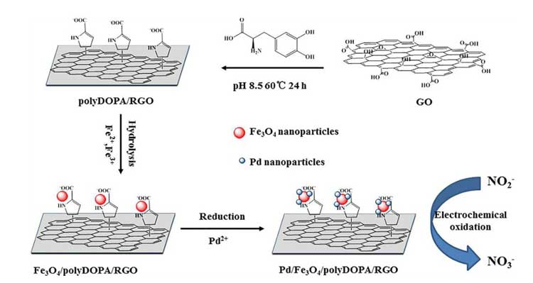 如今,化學還原法是制備石墨烯基納米復合材料的常見方法。但是,用于化學還原氧化石墨烯(GO)和金屬離子的還原劑如肼與NaBH4為有毒害物質,也存在一定的安全隱患。多功能生物聚合物聚多巴胺(PDA)可以通過多巴胺(DA)的自聚合形成表面粘附涂層來修飾各種基材。 PDA涂層可以用作通用平臺,不僅可以改善RGO的親水性并防止RGO團聚,還可以在RGO表面上原位成核和生長金屬、金屬氧化物和半導體等。蘭州大學葉為春課題組基于polyDOPA(3,4-Dihydroxy-l-phenylalanine,DOPA)平臺原位成核和生長Fe3O4和Pd納米粒子。該方法沒有引入還原劑或者結構導向劑,合成的Pd / Fe3O4 / polyDOPA / RGO復合材料作為亞硝酸鹽電化學傳感器,表現出良好的電催化活性。結果表明,這種電化學傳感器檢出限低、選擇性好、線性范圍寬,可以成功應用在河水、香腸制品及白菜腐爛過程中亞硝鹽濃度檢測,在日常檢測中具有廣闊的應用前景。