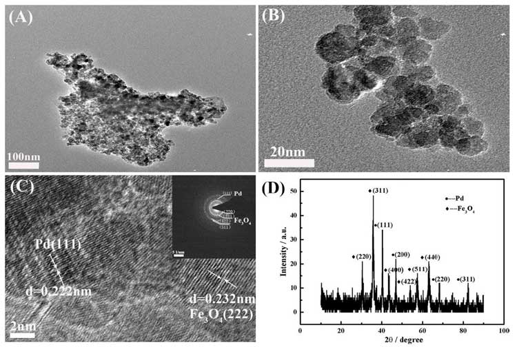 圖2:Pd/Fe3O4/polyDOPA/RGO: TEM, HRTEM及XRD圖