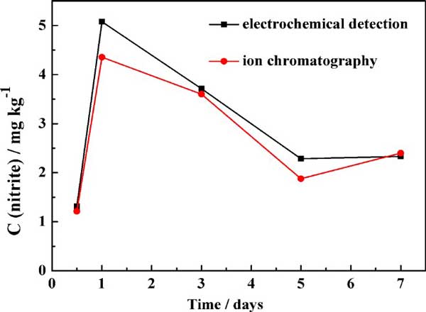 將大白菜在30℃下密封以迅速腐爛,在圖3中可以清楚地看到,亞硝酸鹽含量在開始階段迅速增加,并在24小時內達到最大值(5.08 mg / kg),這是由于硝酸鹽還原為亞硝酸鹽所致。然后,它在2天后積累到很高的水平。 隨后,隨著時間的流逝,亞硝酸鹽的含量逐漸降低。 亞硝酸鹽含量變化的趨勢與常規(guī)離子色譜法測定的結果相符(圖3)。重要的是,該傳感器和離子色譜法測試結果相對偏差值在10%以內,是可以接受的。這些結果表明,該電化學傳感器對于真實樣品中的亞硝酸鹽檢測是可靠且高效的。