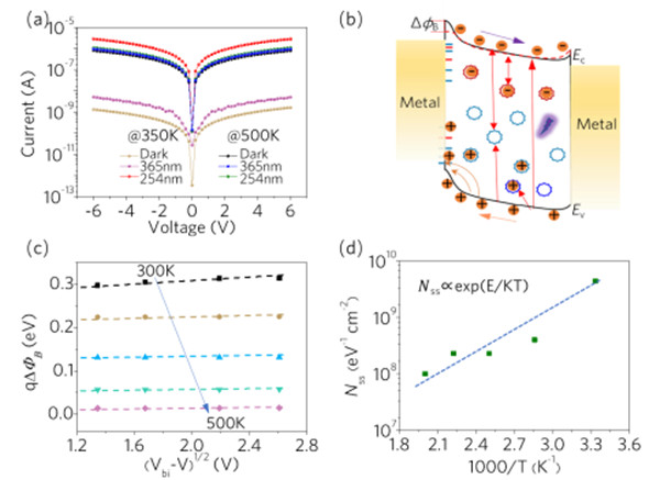 圖5.(a)在不同條件下器件的I-V曲線(xiàn)。(b)MSM ε-Ga2O3 SBPD的能帶示意圖。(c)不同溫度下勢(shì)壘高度作為(Vbi-V)的函數(shù)。(d)被占據(jù)的缺陷態(tài)密度的Arrhenius圖。
