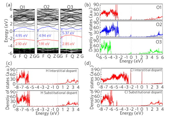 圖9.(a)ε-Ga2O3中三種不等價(jià)氧的能帶結(jié)構(gòu)圖。藍(lán)色和紅色的值分別表示禁帶寬度和價(jià)帶頂上部的氧空位引入的缺陷能級(jí)。(b)三種不等價(jià)氧,(c)間隙/替位雜質(zhì)H和(d)間隙/替位雜質(zhì)Cl 引入的缺陷能級(jí)態(tài)密度。