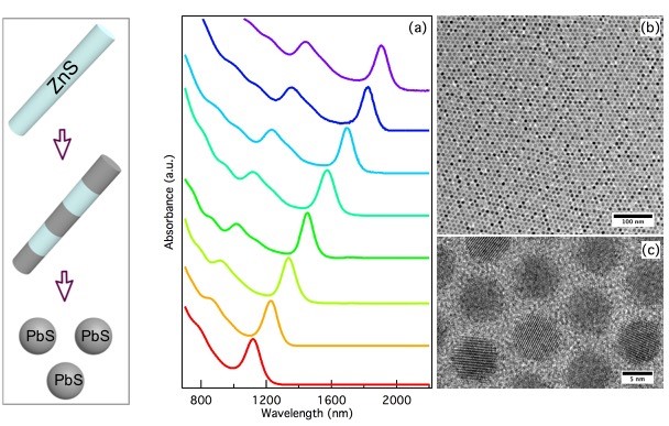 當(dāng)尺寸增加(帶隙減?。r,PbS量子點對空氣的敏感性顯著增加,容易引入新的缺陷態(tài)。因此,研究者們通常采用陽離子交換方法來合成具有原位鹵素離子鈍化的PbS量子點。但是,這種方法合成出的PbS量子點尺寸分布不佳(尤其大尺寸),影響載流子的遷移。為了解決這一問題,張建兵副教授團(tuán)隊首次采用ZnS納米棒到PbS量子點的陽離子交換方案,其基本思想是依靠由棒到點轉(zhuǎn)變過程中因部分溶解而釋放的S來維持一定的過飽和度,促進(jìn)量子點的生長并且維持較好的尺寸分布。系統(tǒng)改變合成參數(shù),在尺寸分布的均勻性、尺寸可控性、重復(fù)性以及宏量制備等方面對陽離子交換合成進(jìn)行優(yōu)化。通過捕獲反應(yīng)和生長的中間態(tài),研究了從棒到點的形貌轉(zhuǎn)變過程和機理以及量子點的生長控制機制。這種從棒到點的陽離子交換合成出的PbS量子點除了具有極好的尺寸分布外,表面還具有鹵素Cl-離子鈍化,實現(xiàn)了較好的表面缺陷態(tài)控制?;谶@種方案合成的高質(zhì)量大尺寸窄帶隙PbS量子點,我們