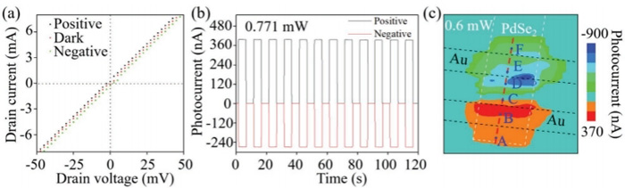 利用轉(zhuǎn)移電極的方法制備器件,不需要使用EBL等大型儀器。探測(cè)器在零偏壓光照射下產(chǎn)生了光電流,當(dāng)光照射在器件的兩端時(shí),產(chǎn)生了正負(fù)光響應(yīng)(圖3)。通過(guò)光電流mapping測(cè)量,顯示光電流信號(hào)不僅出現(xiàn)在材料和電極的接觸區(qū),還出現(xiàn)在遠(yuǎn)離電極和材料接觸的區(qū)域。通過(guò)這種“非局域”光響應(yīng)排除了其他光電流機(jī)理,確定了基于PdSe2的光熱電效應(yīng)。