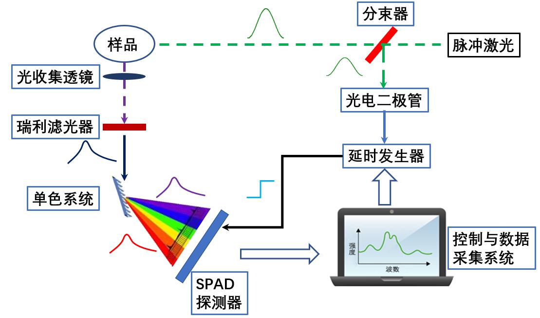 在拉曼散射實(shí)驗(yàn)中,之所可以采用時(shí)間鑒別技術(shù),從測量時(shí)間上只采集拉曼散射信號(hào)而避開對(duì)發(fā)射熒光的接收,這是因?yàn)楫?dāng)激發(fā)光的光子與作為散射中心的分子相互作用時(shí),拉曼散射是在由測不準(zhǔn)關(guān)系所確定的時(shí)間內(nèi)對(duì)分子振動(dòng)態(tài)的布居過程。拉曼發(fā)射很快,約10-14 s,而當(dāng)物質(zhì)分子吸收了特征頻率的光子,就由原來的基態(tài)能級(jí)躍遷至電子激發(fā)態(tài)的各個(gè)不同振動(dòng)能級(jí)。激發(fā)態(tài)分子經(jīng)與周圍分子撞擊而消耗了部分能量,迅速下降至第一電子激發(fā)態(tài)的最低振動(dòng)能級(jí),并停留約10-9秒之后,直接以光的形式釋放出多余的能量,下降至電子基態(tài)的各個(gè)不同振動(dòng)能級(jí),此時(shí)所發(fā)射的光即是熒光。因此熒光壽命則通常在 10-8 ~10-12 s 內(nèi)。由此可見,樣品中的拉曼散射信號(hào)相對(duì)于其熒光信號(hào)的壽命要短的多,使用連續(xù)激光激發(fā)的話,熒光信號(hào)的強(qiáng)度會(huì)遠(yuǎn)大于拉曼信號(hào)的強(qiáng)度,以至于熒光信號(hào)湮沒了拉曼信號(hào)。因此,在時(shí)間分辨拉曼散射測量中,通??梢圆捎面i模激光器產(chǎn)生的超短脈沖激發(fā),使用具有電子快門的光子計(jì)數(shù)器處理,就可實(shí)現(xiàn)時(shí)間門控制技術(shù)方法,把拉曼光譜信號(hào)從強(qiáng)熒光背景中提取出來。其核心技術(shù)方法就在于,利用拉曼信號(hào)與熒光信號(hào)產(chǎn)生的時(shí)間差別,將激發(fā)光激發(fā)時(shí)間控制在拉曼信號(hào)產(chǎn)生的時(shí)間窗口內(nèi),從而達(dá)到只收集拉曼散射光譜信號(hào)而拒絕收集時(shí)間窗口外的熒光等其它信號(hào)。圖2 所示是由皮秒級(jí)脈沖激光、皮秒級(jí)高靈敏度單光子陣列傳感計(jì)數(shù)器(SPAD)、皮秒級(jí)高精度的時(shí)間門控延時(shí)電路和多道光譜儀及其電子控制與數(shù)據(jù)采集系統(tǒng)等部件組成的時(shí)間門控拉曼光譜儀原理圖。