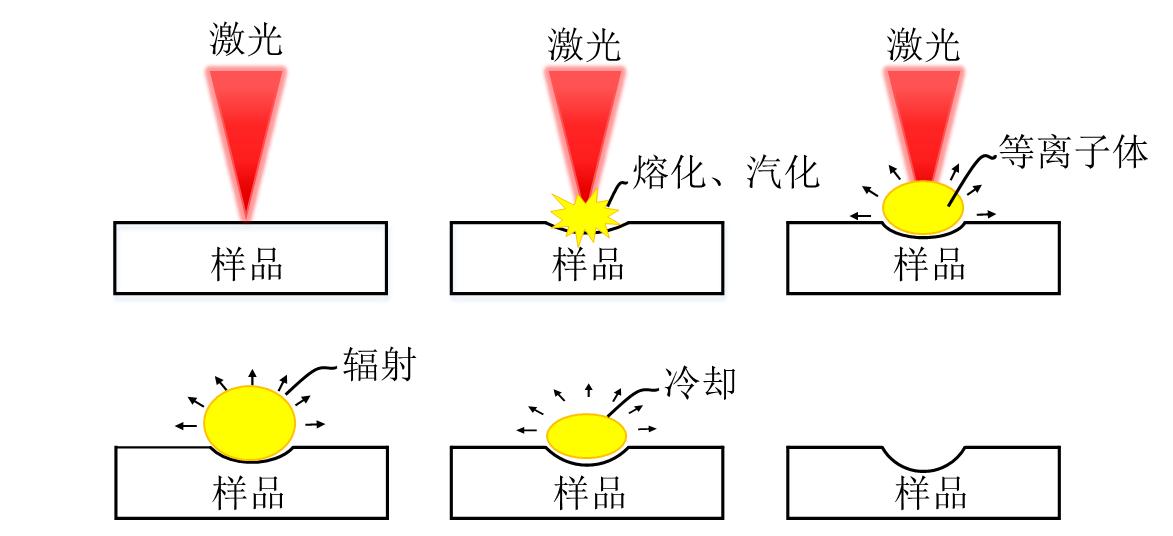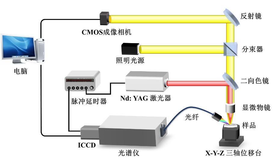 元素分布成像是一種能夠?qū)⒖臻g坐標(biāo)與元素組成信息聯(lián)系起來的分析技術(shù),通過對樣品中元素成份微米級別的空間分布進(jìn)行定性或定量評估,讓人們對物質(zhì)的演化、材料的組成、雜質(zhì)的分布等進(jìn)行更深入的分析。激光誘導(dǎo)等離子體光譜(laser-induced plasma spectroscopy, LIPS)技術(shù)是一種原子光譜分析技術(shù),原理如圖1所示。該技術(shù)通過將高能激光脈沖直接聚焦于樣品表面,瞬間完成取樣、原子化及激發(fā)的全過程,同時利用光譜儀采集樣品表面激光誘導(dǎo)等離子體的發(fā)射光譜,完成被測樣品所含元素的定性和定量分析[1]。LIPS技術(shù)具有無需樣品預(yù)處理、可多元素定量分析、檢測速度快、實時檢測等獨(dú)特優(yōu)勢,近年來被廣泛應(yīng)用于礦石、核材料、動植物組織等樣品的元素分布成像[2]。