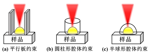 空間約束增強(qiáng)LIPS(Spatial Confinement LIPS, SC-LIPS)是一種成本較低的等離子體輻射光譜增強(qiáng)方法,通過(guò)采用空間約束裝置對(duì)等離子體的膨脹過(guò)程進(jìn)行約束,可以提高等離子體輻射強(qiáng)度。激光誘導(dǎo)等離子體產(chǎn)生后,等離子體羽流向外快速膨脹,當(dāng)膨脹過(guò)程中撞到空間約束裝置時(shí)會(huì)產(chǎn)生一個(gè)反作用力,使等離子體壓縮,等離子體壓縮后體積變小,內(nèi)部粒子碰撞幾率增加,導(dǎo)致等離子體輻射光譜強(qiáng)度增加[7,8]。常用的空間約束裝置有平行板、圓柱形腔、半球形腔等,約束腔結(jié)構(gòu)如圖3所示。