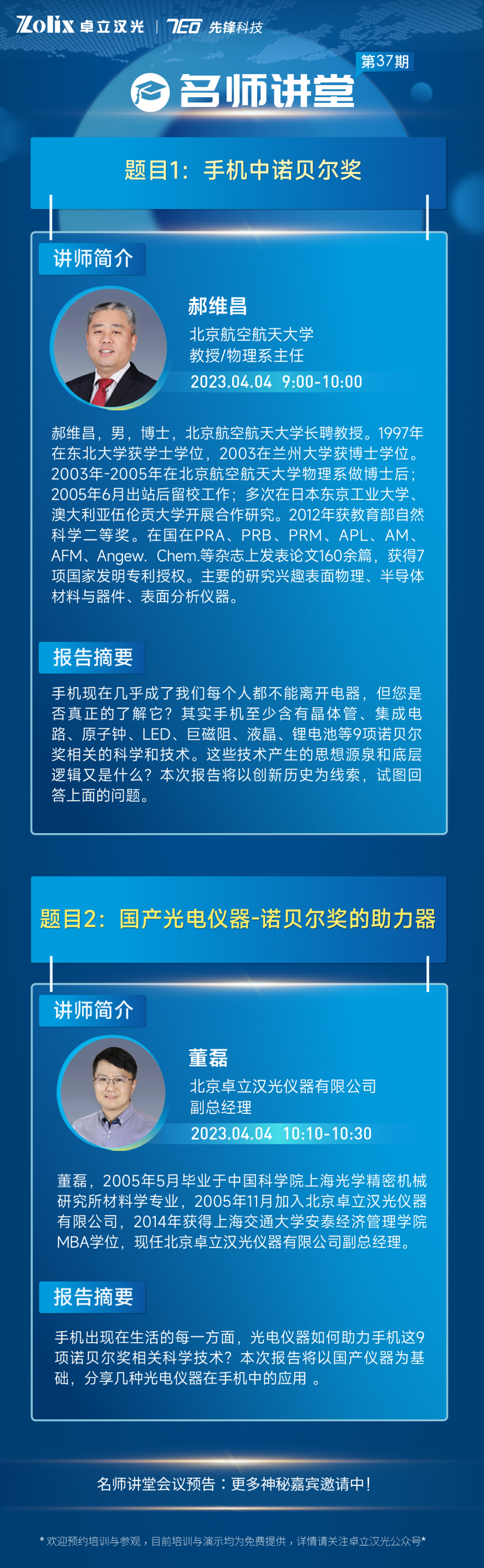 本期卓立漢光隆重邀請到了北京航空航天大學(xué)教授、物理系主任郝維昌老師和卓立漢光董磊副總經(jīng)理,兩位老師將與大家分享自己科研領(lǐng)域的經(jīng)驗和心得體會。希望本次講座能夠為您的科學(xué)研究帶來靈感與助力,推動研究的進展,精彩不容錯過,掃描下方的二維碼,趕快報名開啟學(xué)習(xí)之旅吧~